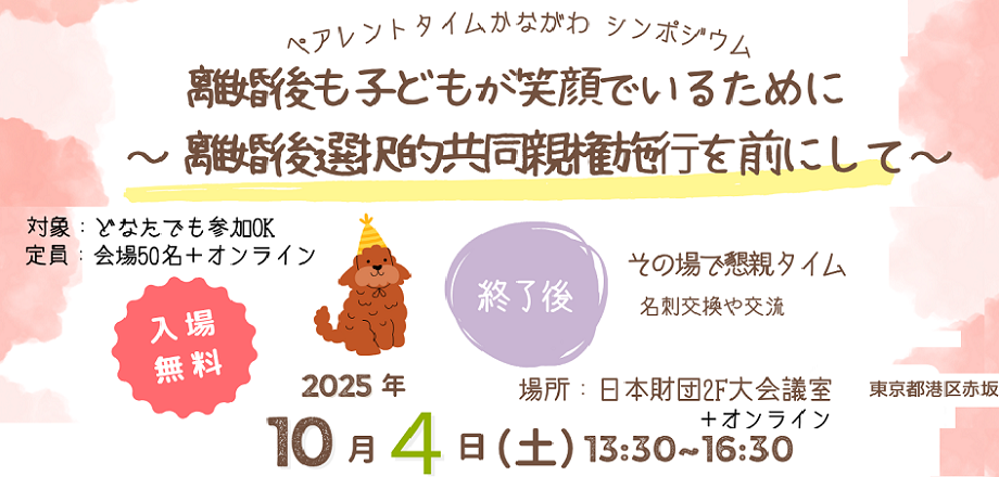 「第3回ペアレントタイムかながわ」シンポジウムでは、「離婚後の親子関係」「親子交流」「養育計画」「親ガイダンス」などをテーマに、国内外の専門家や支援の現場で活動する実践者が、わかりやすくお話しします。「選択的共同親権」制 […]