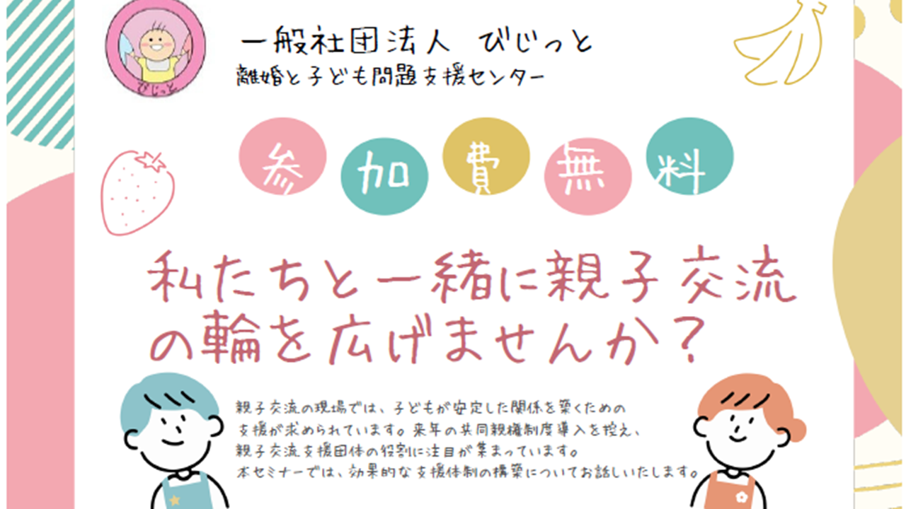 昨年に引き続き、びじっとの親子交流支援利用者を対象にアンケート調査をおこないました。 ――<<調査トピックス>>―――①親子交流の不安が、支援利用で激減②支援を利用して親子交流する同居親の養育費受給率は82%③親子交流を […]